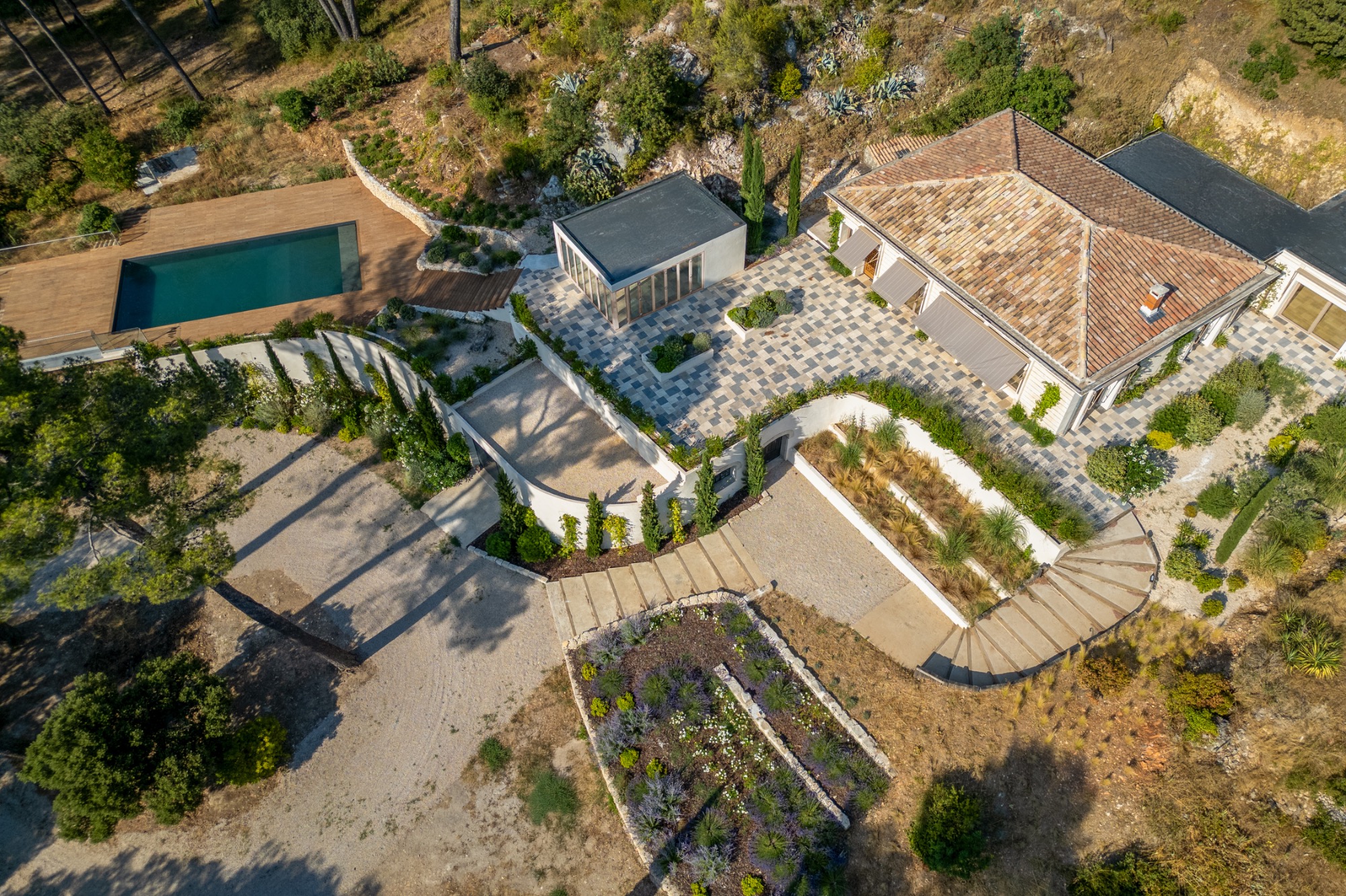 Terrasses élégantes, oliviers et lisière de forêt méditerranéenne dialoguent avec le murmure des cascades, créant des perspectives uniques et des espaces de vie en plein air empreints de sérénité.